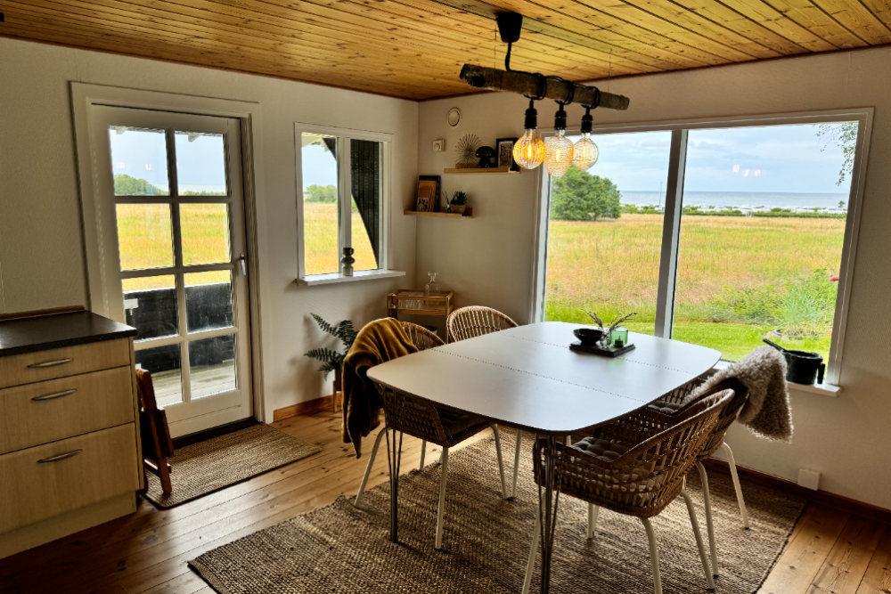 Huset er 70 m2, der er 2 separate soveværelser, og det ligger med skoven i baghaven og engen med udsigt ud over havet, Kattegat, foran huset.